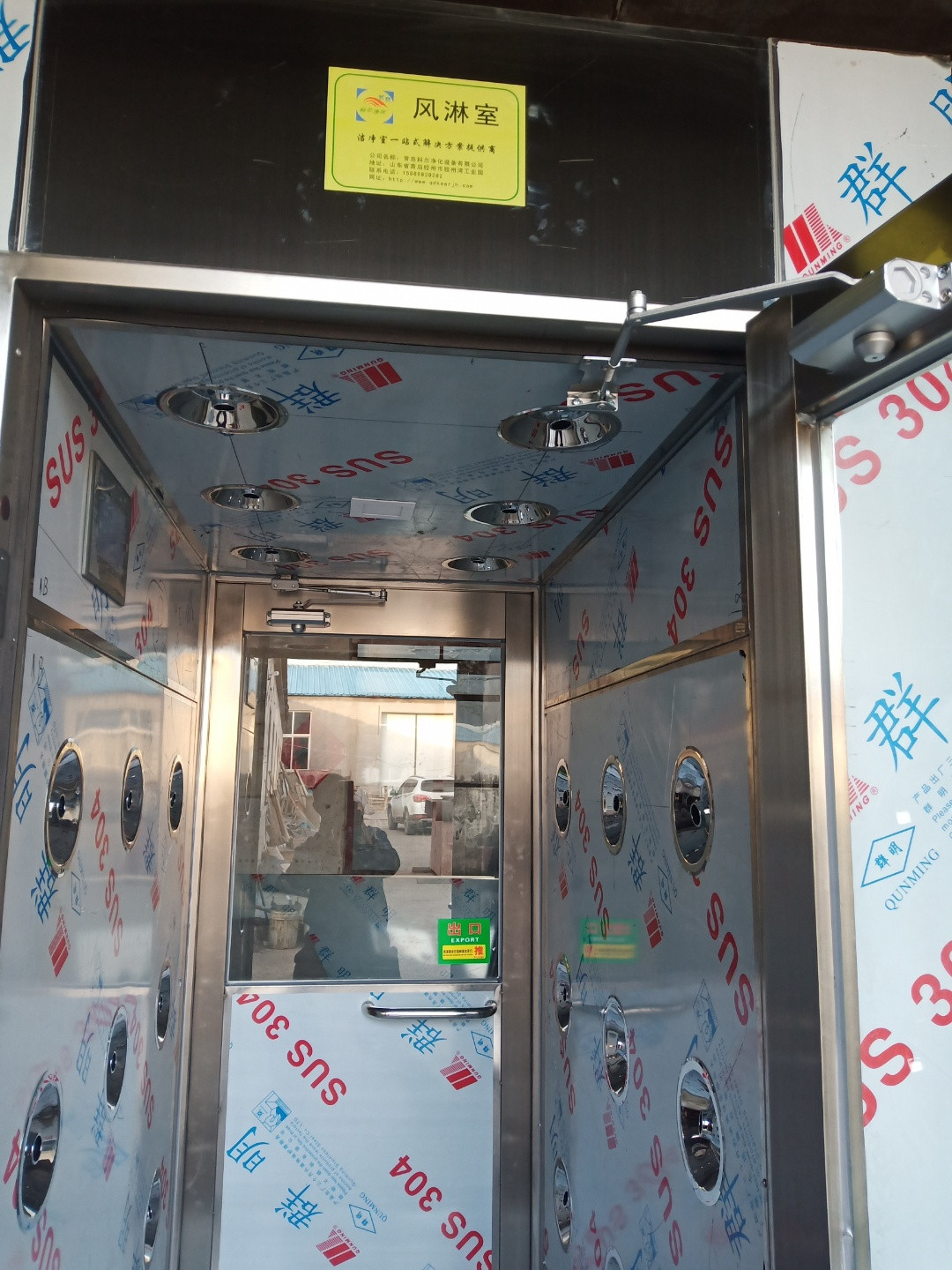 3、拉開不銹鋼風(fēng)淋門人員進(jìn)入風(fēng)淋室后,風(fēng)淋門立即自動(dòng)關(guān)閉外門,紅外線(聲控/人體熱能)感應(yīng),風(fēng)淋自動(dòng)啟動(dòng),吹淋15秒(出廠已設(shè)置)。注意:風(fēng)淋室在吹淋時(shí)兩個(gè)不銹鋼門不能同時(shí)打開,如強(qiáng)行打開將損壞電子鎖,風(fēng)淋室兩門是電子互鎖控制。