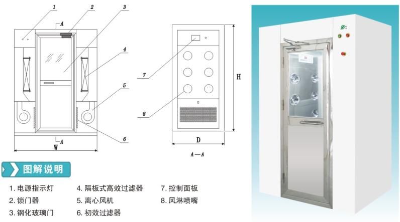 1. 風(fēng)淋室由箱體、門、高效過(guò)濾器、初效空氣過(guò)濾器,送風(fēng)機(jī)、配電箱、噴嘴等幾大部件組成。