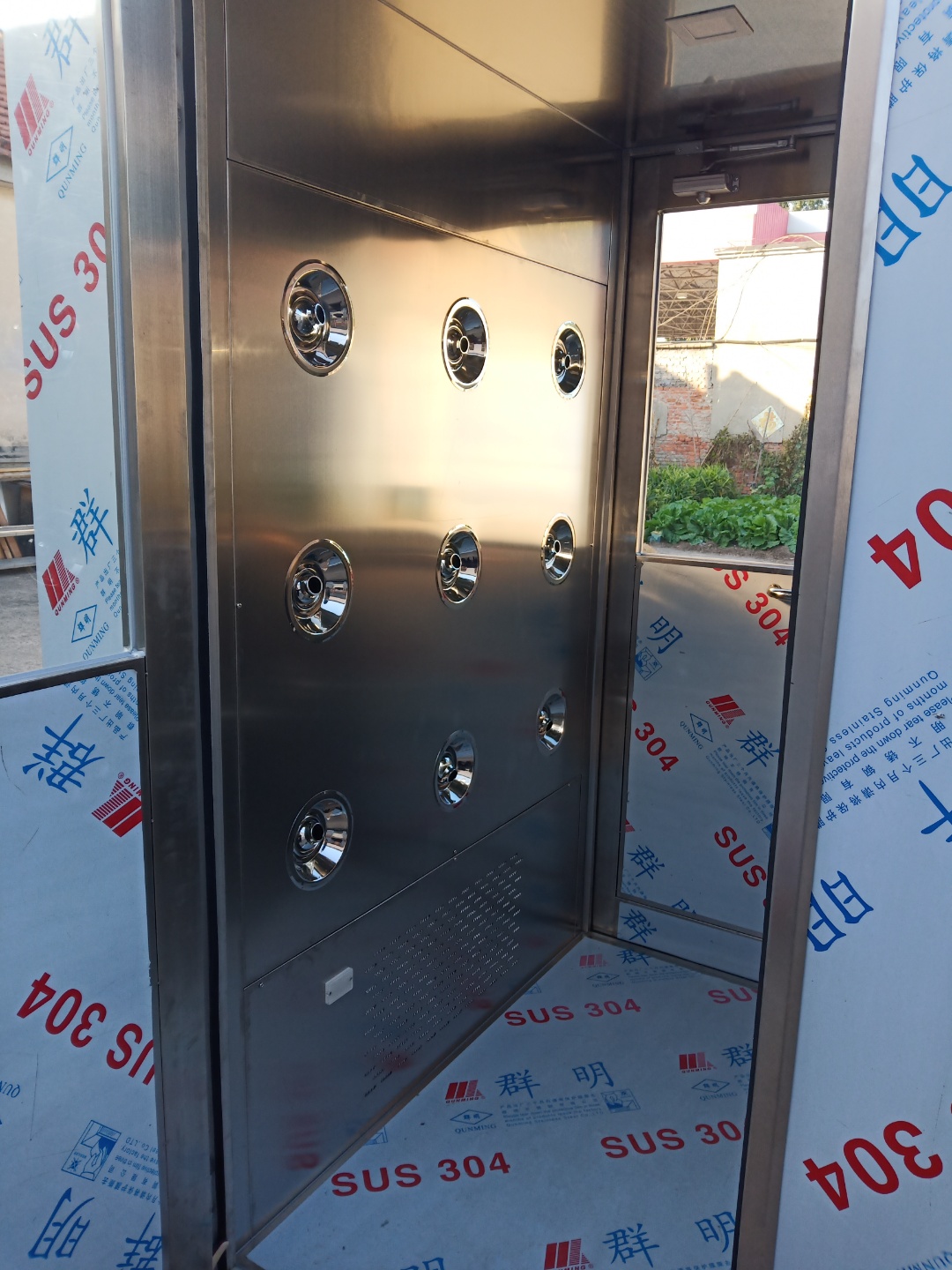 (3)拉開不銹鋼風淋門人員進入風淋室后,風淋門立即自動關(guān)閉外門,紅外線(聲控/人體熱能)感應,風淋自動啟動,吹淋15秒(出廠已設置)。注意:風淋室在吹淋時兩個不銹鋼門不能同時打開,如強行打開將損壞電子鎖,風淋室兩門是電子互鎖控制。